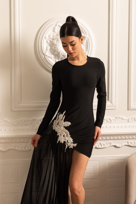 Sırt Dekolteli ve Çiçek Süslemeli Abiye Elbise – Siyah