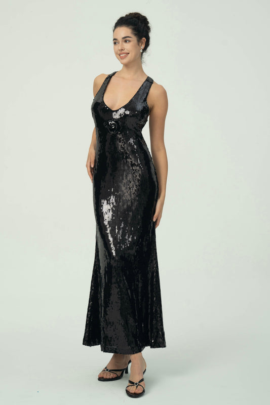 Çiçek Detaylı Göz Alıcı Siyah Pullu Maksi Elbise