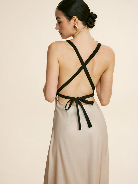İNDİRİM 4%Kontrast Bağlama Detaylı Maxi Elbise
