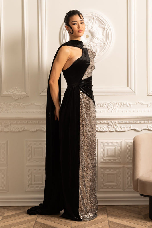 Siyah Kadife Vurguları Olan Göz Alıcı Pullu Elbise
