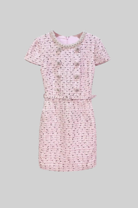 Kısa Kollu ve Eşleşen Kemerli Zarif Dokulu Mini Elbise
