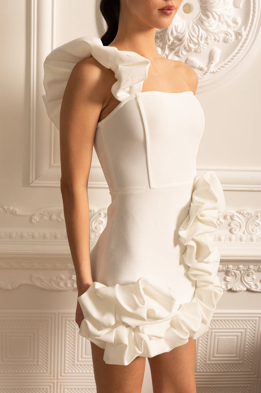 Fırfırlı Etek Ucu ve Omuz Askılı Çiçek Desenli Mini Elbise – Beyaz