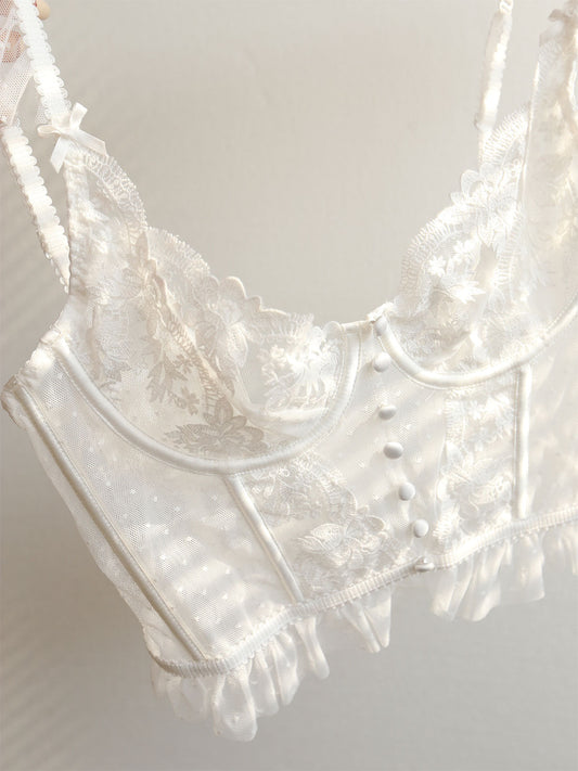 İNDİRİM 15%Şeffaf Nakışlı Çiçekli Ruffle Dantel Korse