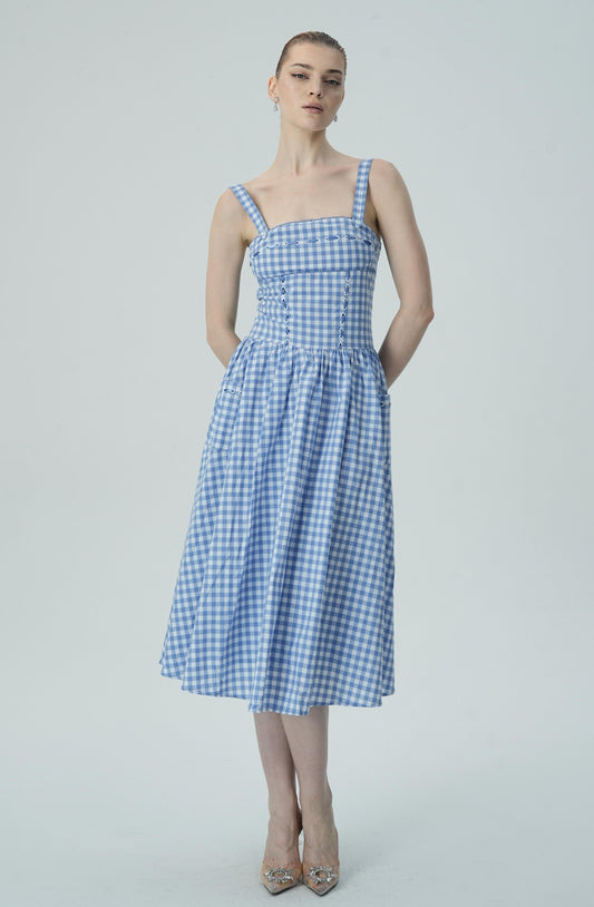 İNDİRİM 8%Bağcık Detaylı Mavi Pötikare Midi Elbise