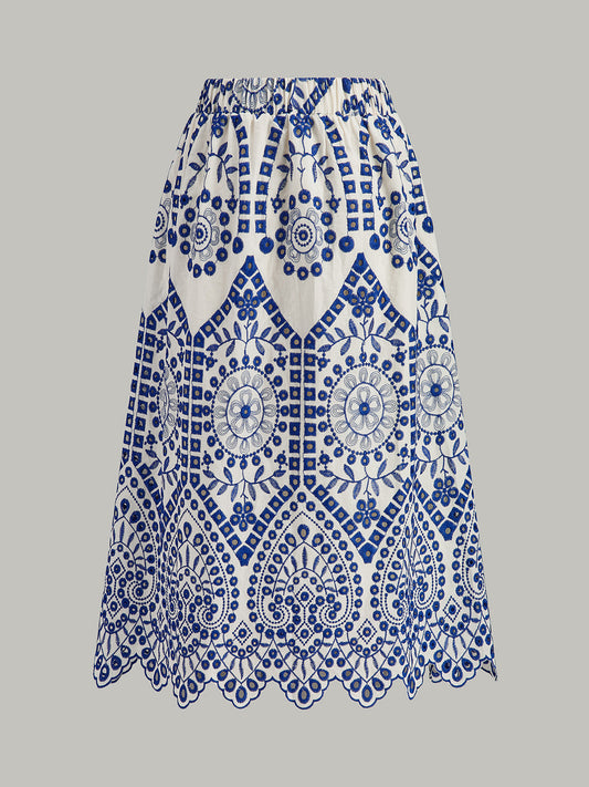 Şık Pamuklu Nakışlı Etek, Dalgalı Kenar ve Rahat Lastik Bel Bandı ile