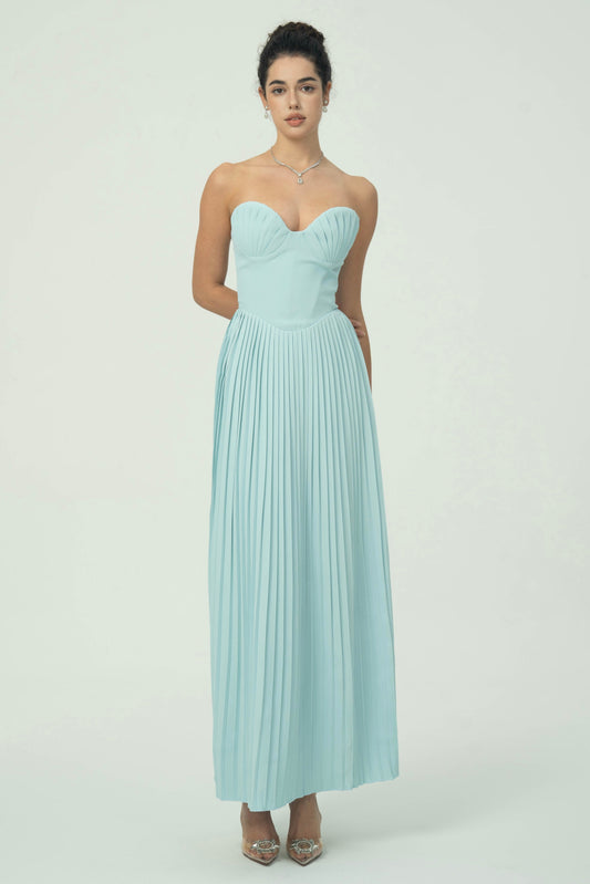 İNDİRİM 12%Zarif Straplez Pileli Maksi Elbise
