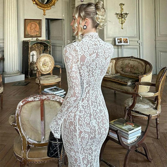 İNDİRİM 44%Zarif Yüksek Yaka Dantel Maksi Elbise