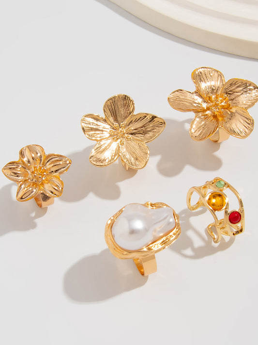 Altı Parçalı Yüzük Seti, İnci ve Çiçek Aksanları ile