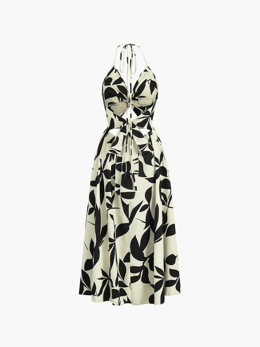 Çiçek Desenli Kesik Büküm Detaylı Halter Uzun Elbise