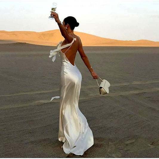 İNDİRİM 41%Saten Kurdele Bağcıklı Sırtı Açık Maksi Elbise