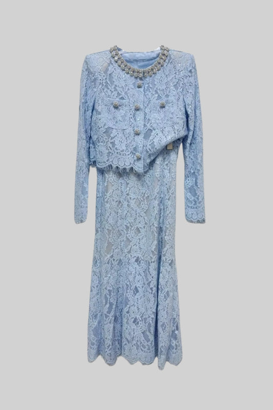 Işıltılı Yaka Süslemeli ve Midi Etekli Dantel Takımı