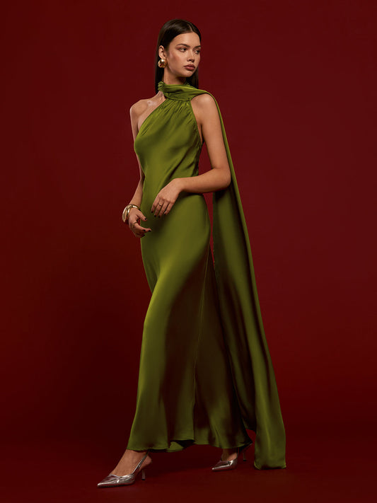 Ayışığı Saten Abiye Elbise Asimetrik Tek Omuz Uzun Elbise