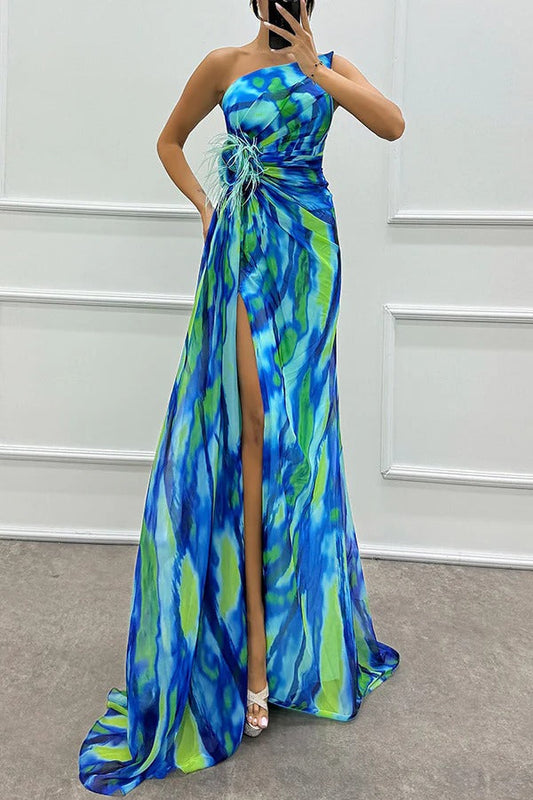Illyra - Omuz Dekolteli yırtmaçlı Baskılı Maxi Elbise