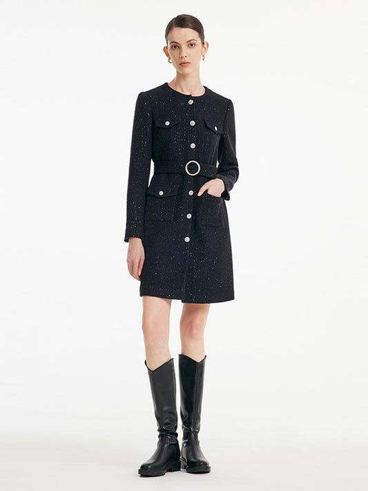 Çıkarılabilir Yaka Detaylı Tweed Bel Vurgulu Yünlü Elbise