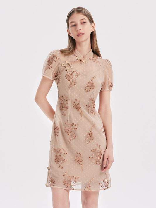 İNDİRİM 42%Bej Renkli Nakışlı Çiongşam Qipao Mini Elbise