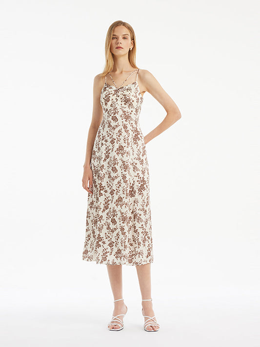 İNDİRİM 48%Çiçek Desenli Kadın Midi İnce Askılı Elbise