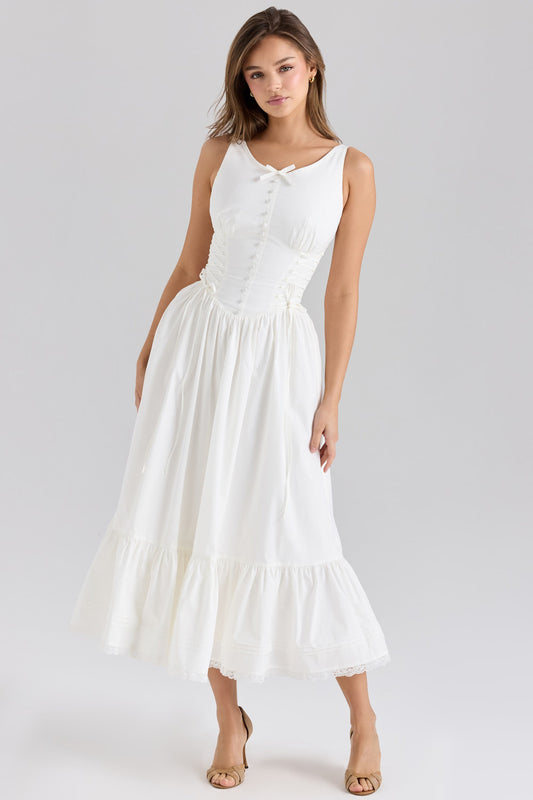 İNDİRİM 21%Beyaz Esnek Pamuk Bağcıklı Midi Elbise