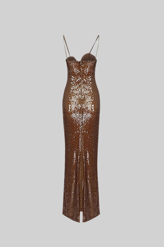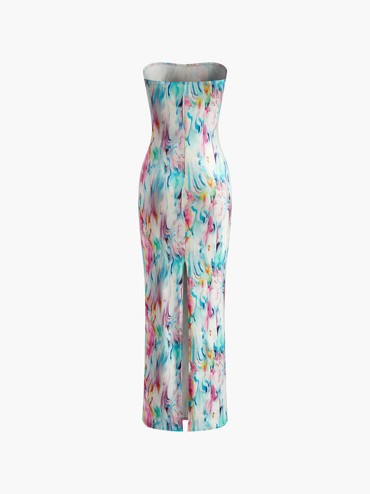 Melinda Baskılı Straplez Yırtmaçlı Midi Elbise