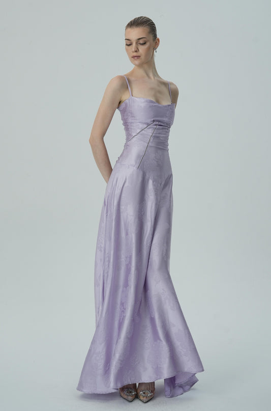İNDİRİM 30%Lavanta Çiçekli Jakarlı Saten Maksi Elbise
