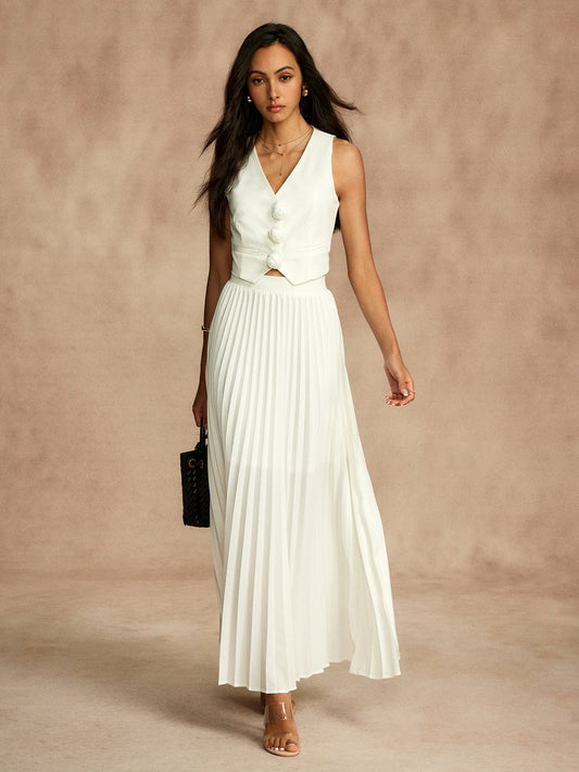 Düğmeli Askılı Yelek ile Pileli Uzun Etek Takım