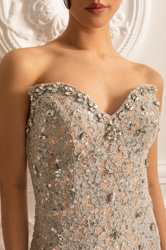 Lüks Tüy Süslemeli Payetli Straplez Elbise
