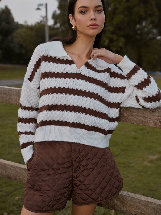 Şık İki Renkli Çizgili Yaka Kısa Kazak ile Şık Rahatlık