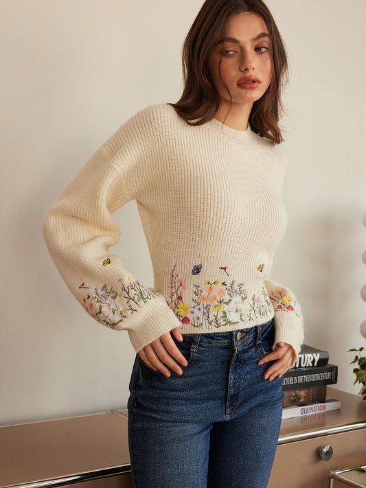 İNDİRİM 39%Şık Nakışlı Büzgülü Kazak, Şamdan Kol Modelli