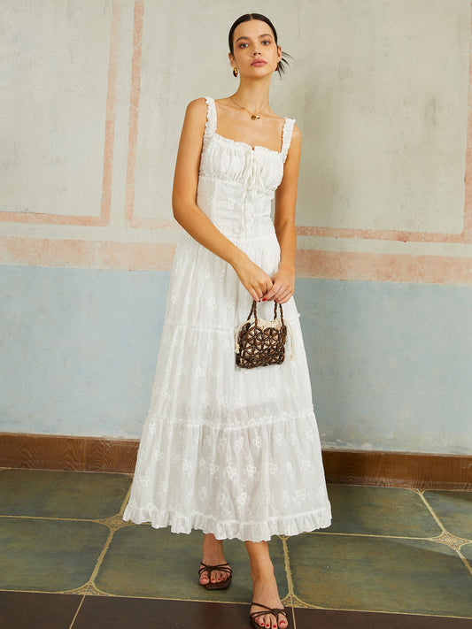İNDİRİM 38%Fırfırlı Etek Kolsuz İşlemeli Uzun Elbise