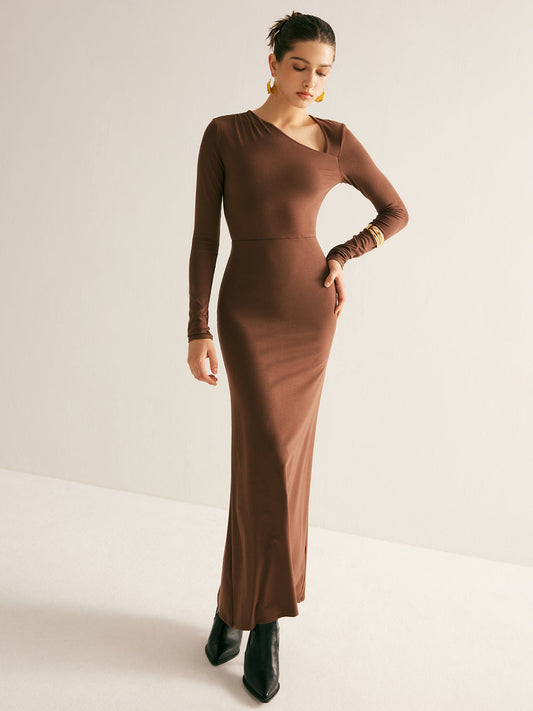 İNDİRİM 38%Düz Asimetrik Yaka Uzun Elbise