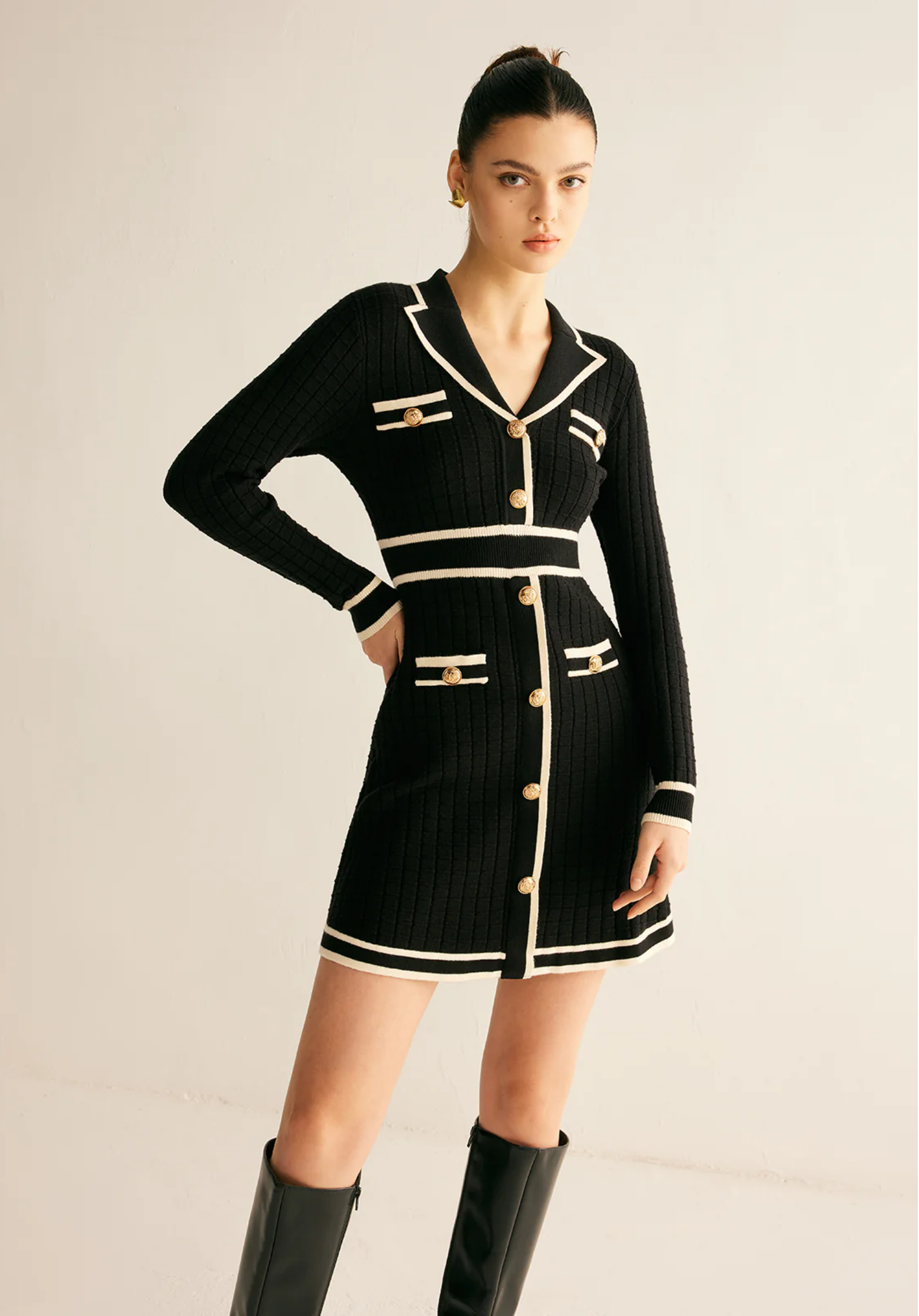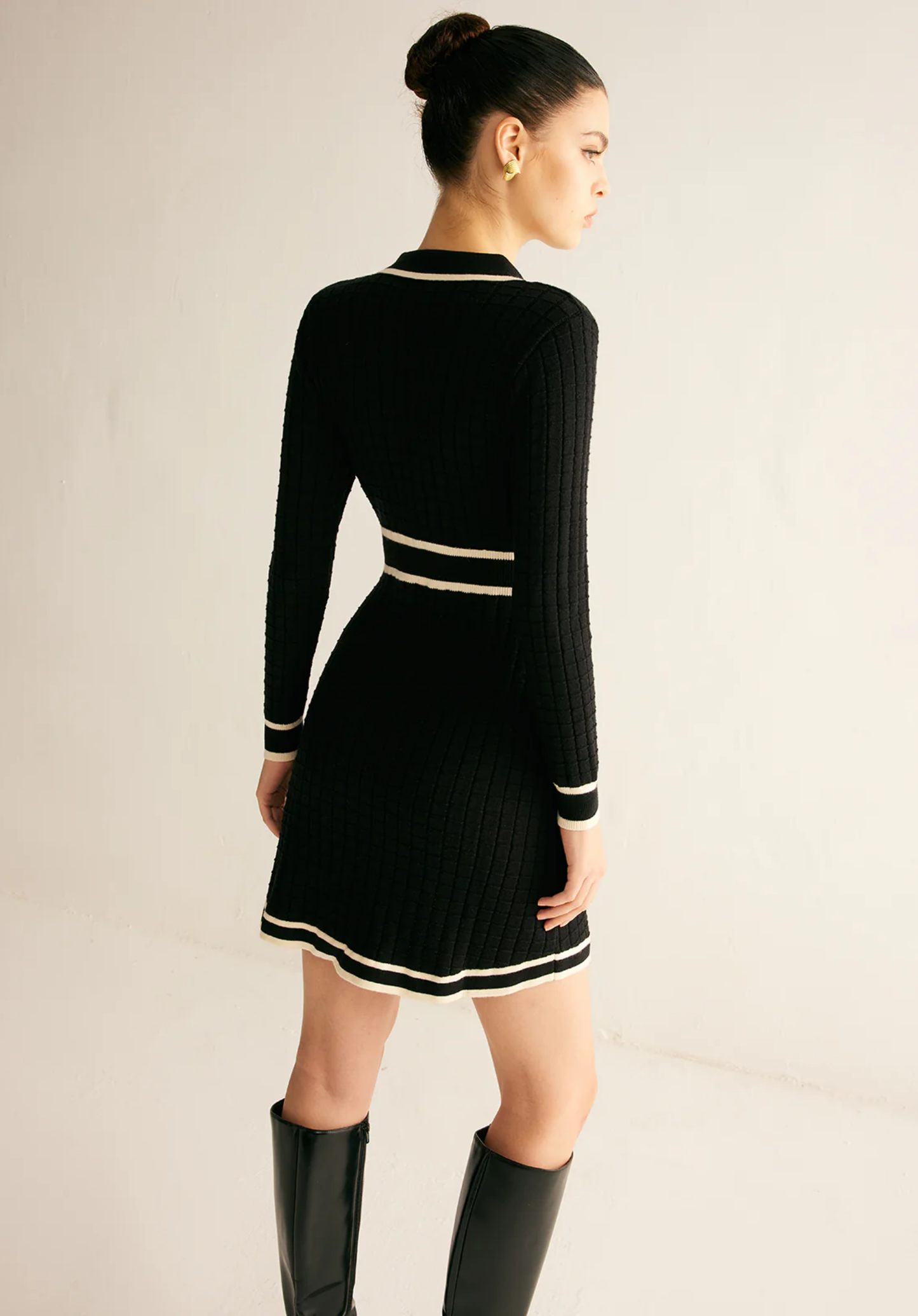 Şık Kontrast Detaylı Metal Aksanlı Midi Kazak Elbisesi
