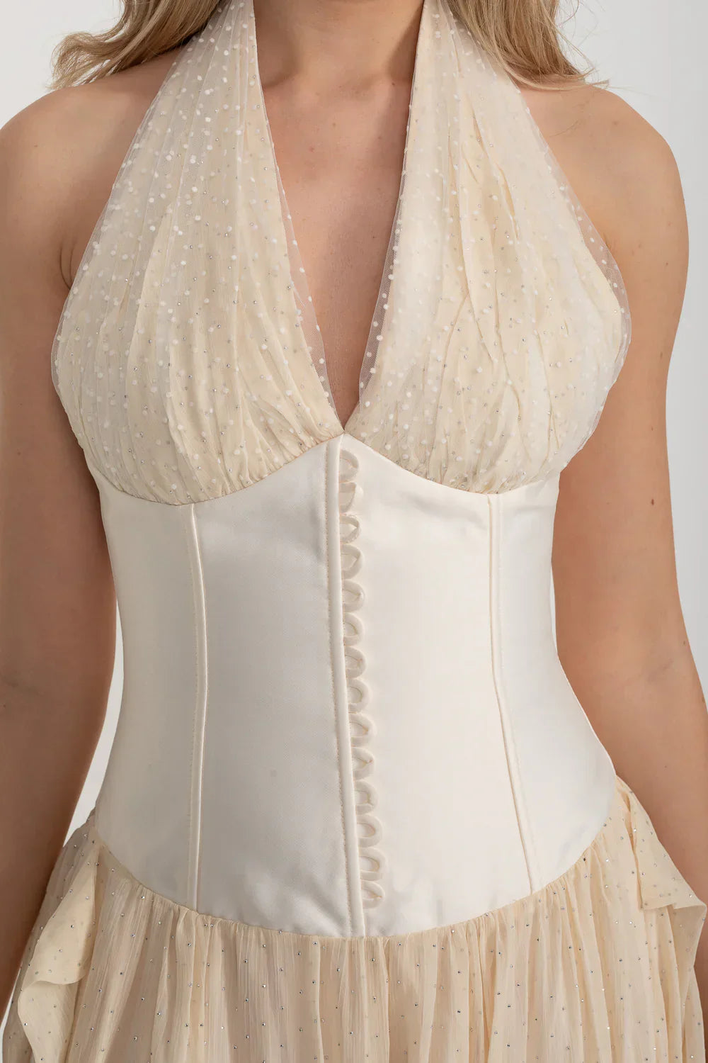 • Ivoire Korse Tarzı Gövdeli ve Dökümlü Maksi Etekli Zarif Elbise