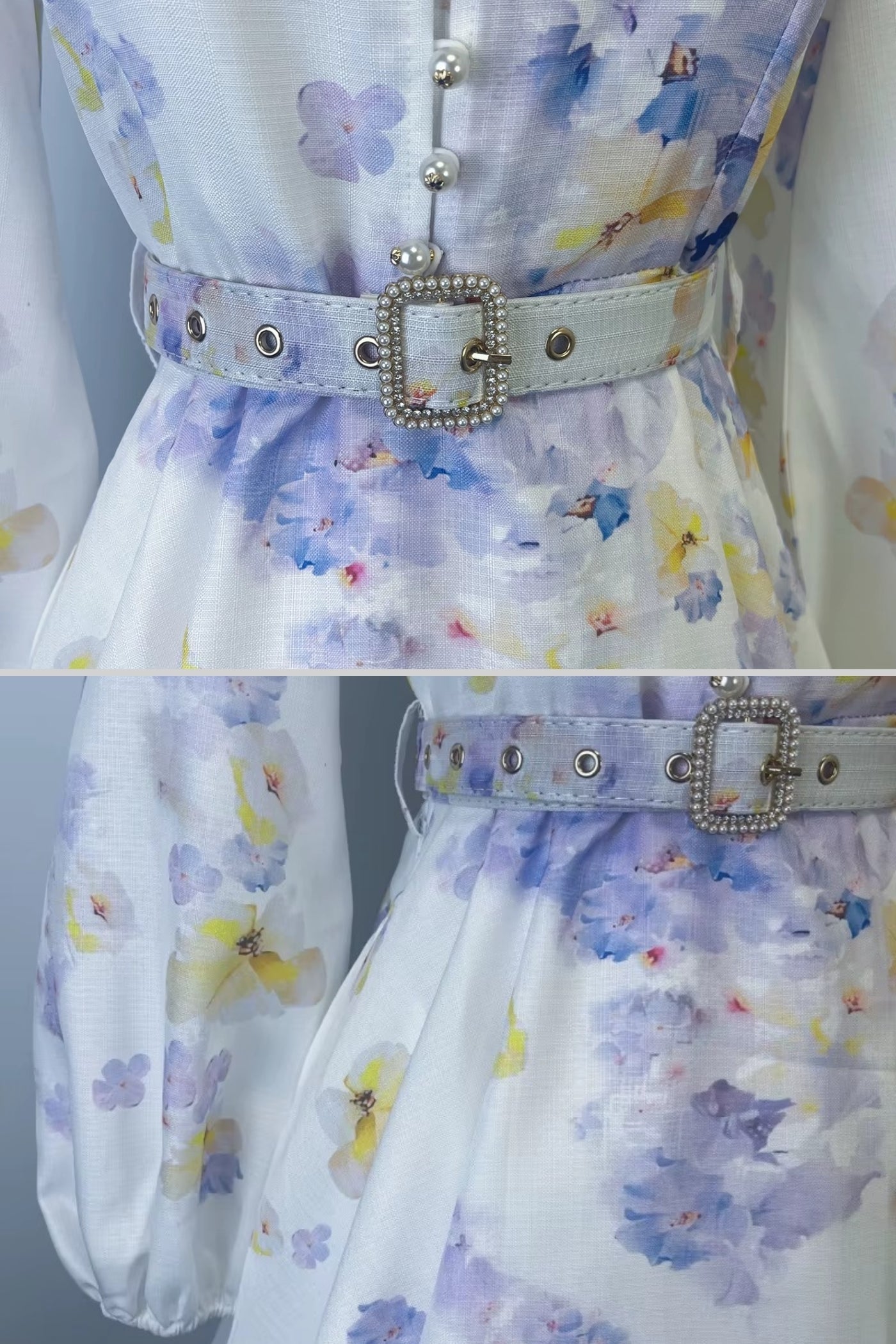 • Beyaz Uzun Kollu Elbise, Mor ve Sarı Çiçek Motifi ile