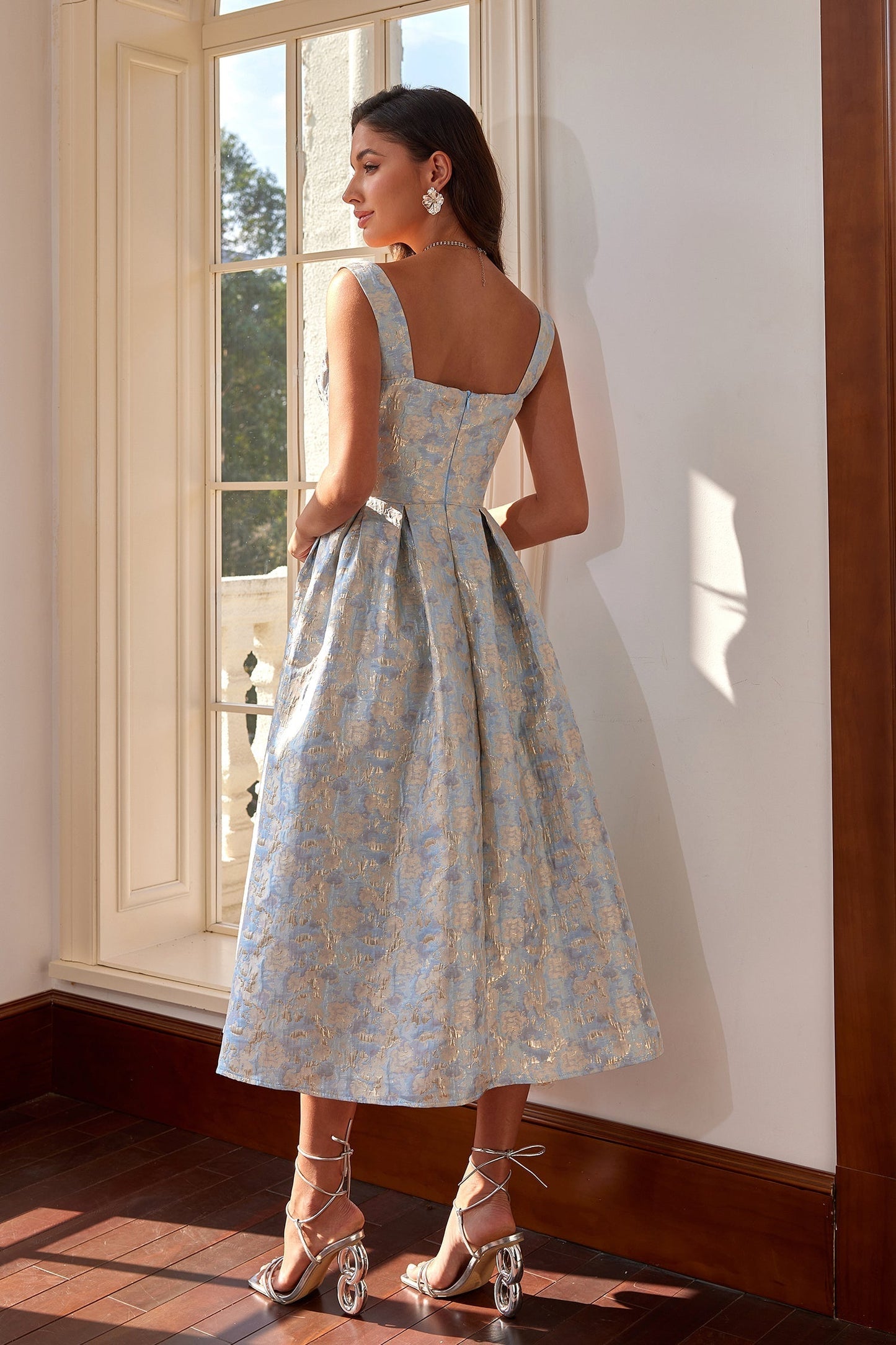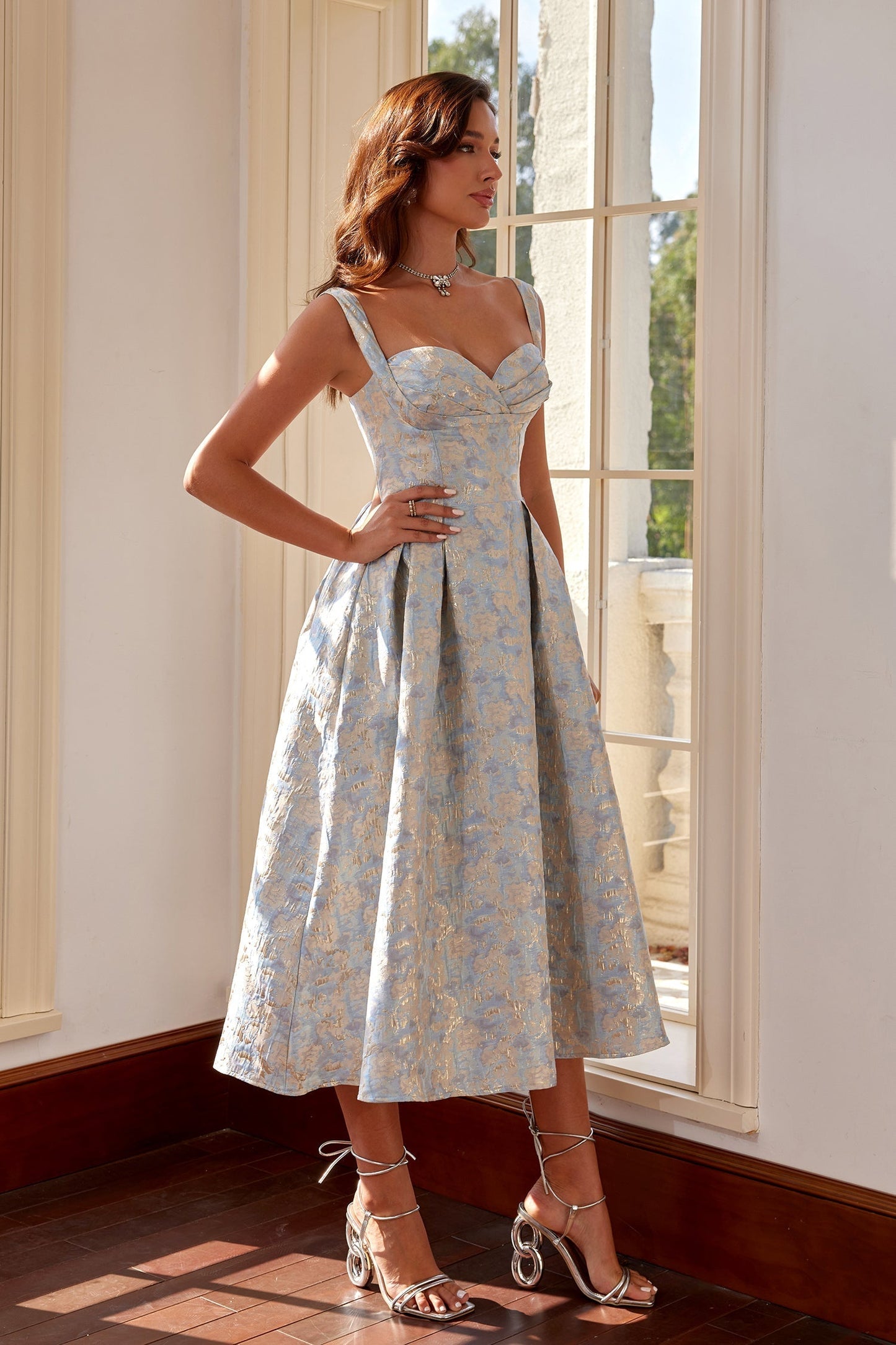 Bu göz alıcı parça, yapılandırılmış kalp yaka detayı ve geniş omuz askılarıyla romantik ve asil bir duruş sunar. Yumuşak mavi zemin üzerine işlenmiş ışıltılı altın detaylı jakar kumaşı, lüksü ve zarafeti bir araya getirerek büyüleyici bir kontrast oluşturur. İnce belli yapısı ve pilili A kesim eteği sayesinde her vücut tipine uyum sağlayan şık bir siluet sunar.