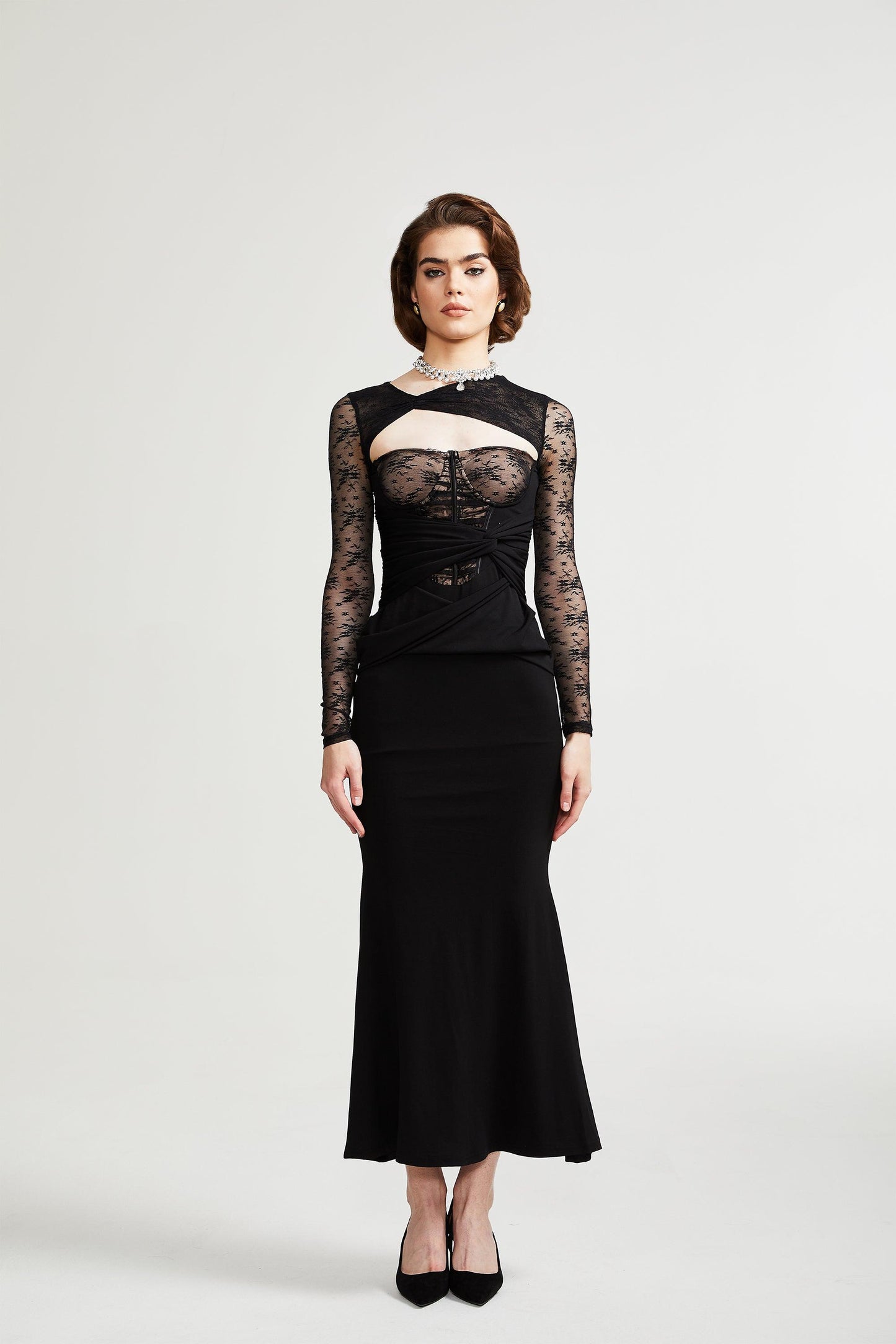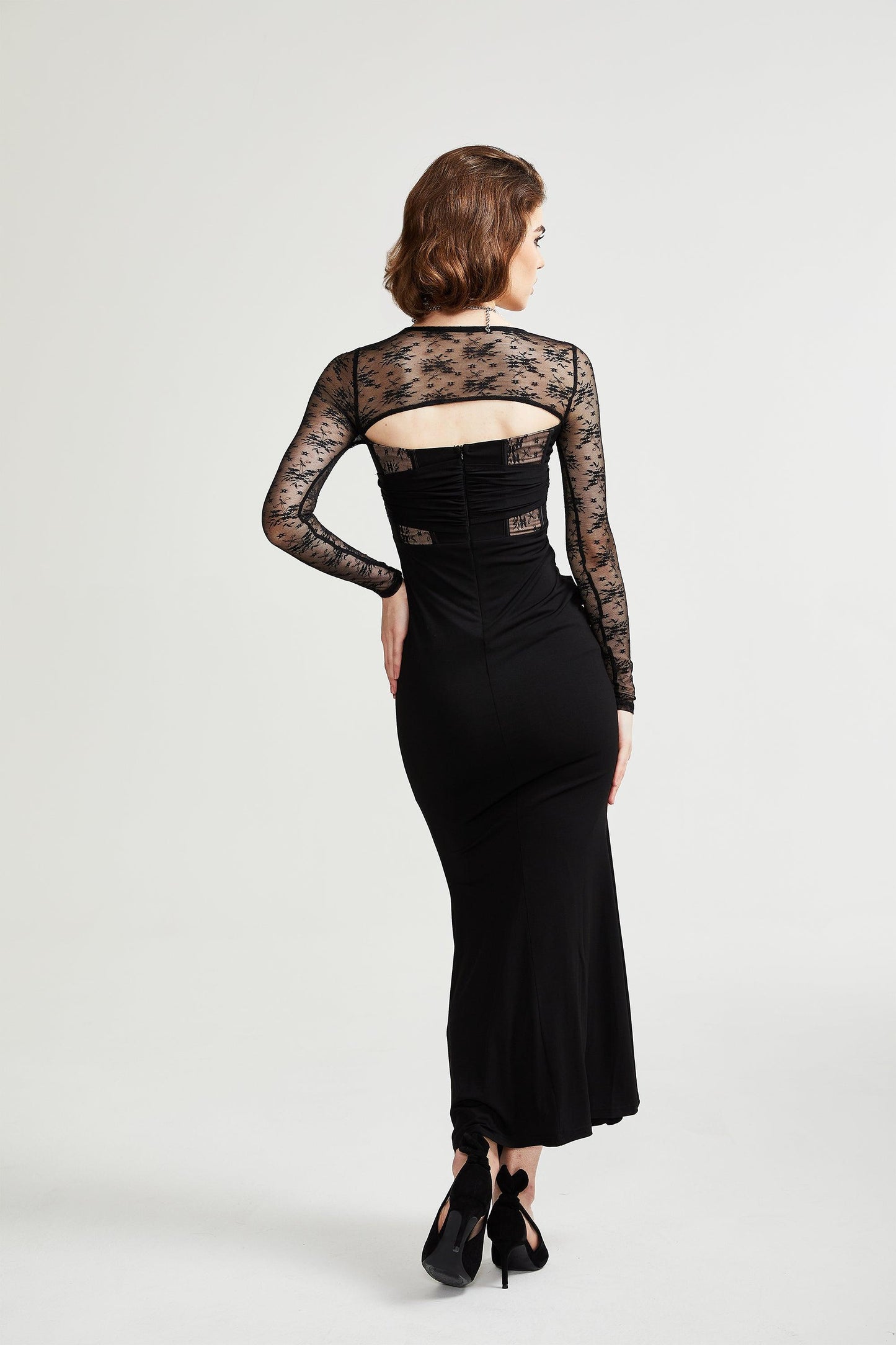 V Yaka Döktuçe Yüksek Kol Düğmeli Dar Elbise