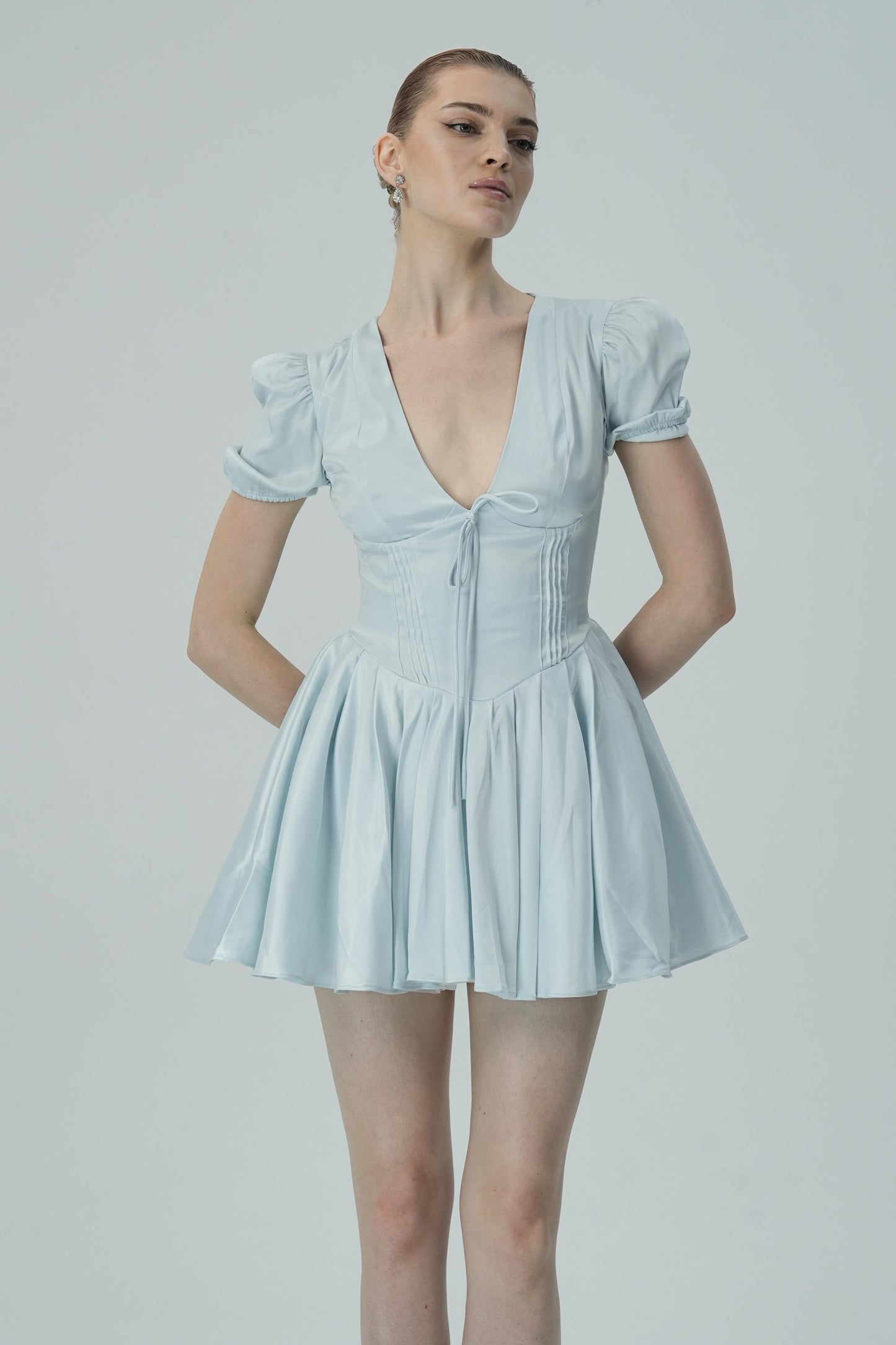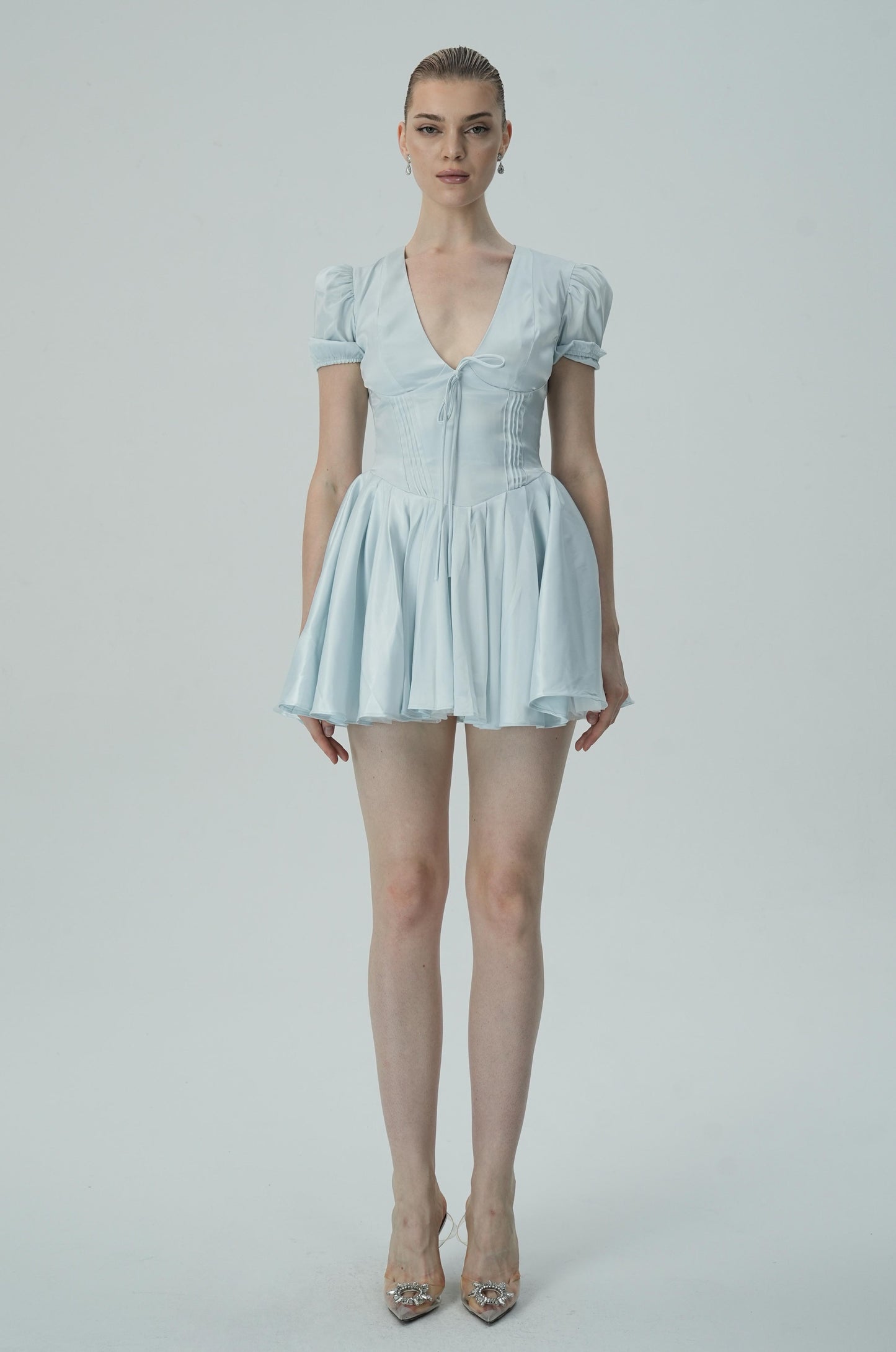 V Yaka Döktuçe Yüksek Kol Düğmeli Dar Elbise