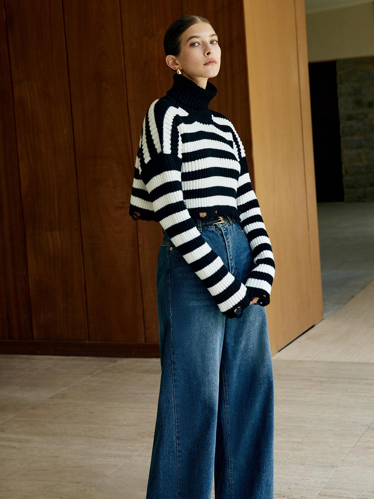 Siyah Beyaz Çizgili Triko Kazak