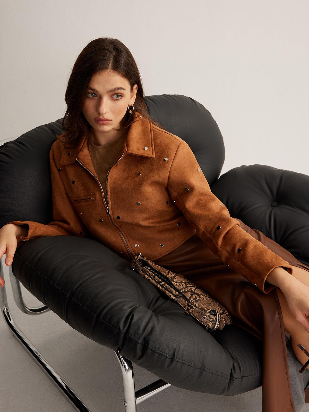 Studded Suede Crop Ceket, modern tasarımı ve zarif detayları ile şıklığı yeniden tanımlıyor. Minimalist kesimi ve metal detaylarla süslenmiş yüzeyi, casual ve şık kombinler için ideal bir seçim sunar. İster günlük stilinizi yükseltin, ister özel bir etkinlikte dikkat çekici bir görünüm elde edin.