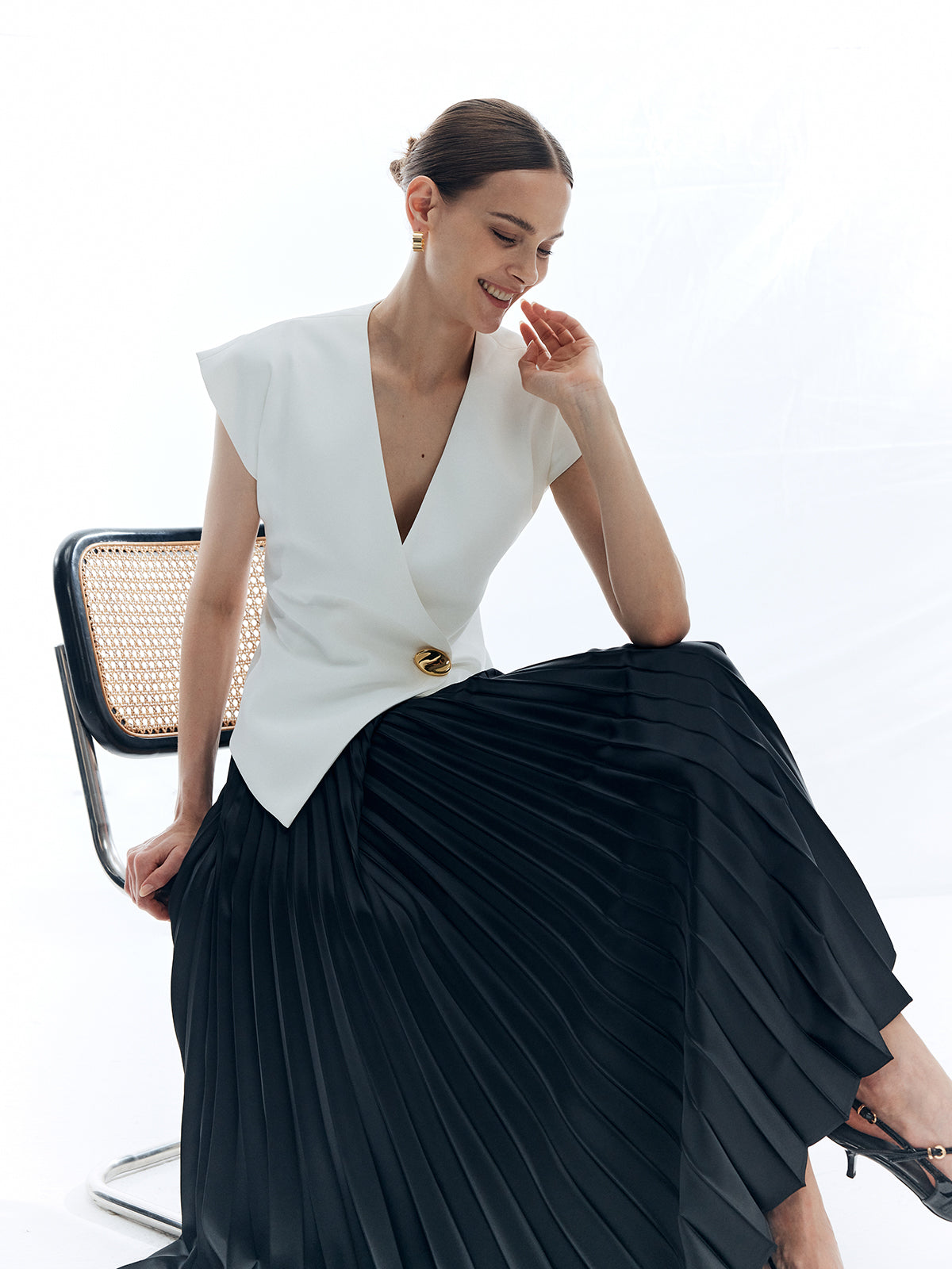 V Yaka Döktuçe Yüksek Kol Düğmeli Dar Elbise